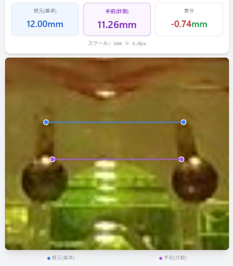 - 根元(1点目・2点目):動かない盤面側の釘の中心を左右タップ。ここが基準の12mmになります。