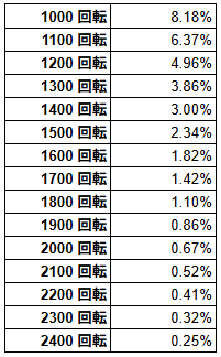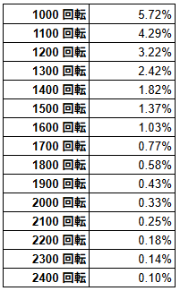 1000ハマる確率は「5.72%」あり、1600ハマる確率は「1.03%」あります。2000ハマる確率は「0.33%」で、2400回転ハマる確率は「0.10%」という感じです。