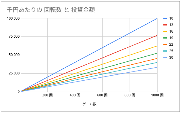 例えば「1000円あたり10回転」しか回らない場合、1000回転で10万円なので、倍の2000回転回せば20万円かかります。1000円あたり16回転ぐらいなら、1000回転で約6万円ほどかかる感じですね……。